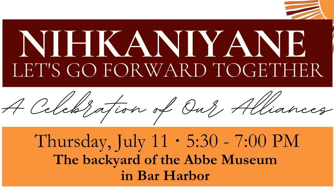 The Wabanaki Alliance will host our second annual Nihkaniyane: Let’s Go Forward Together event, a celebration of our friendships and alliances, from 5:30-7 PM on Thursday, July 11 in Bar Harbor.